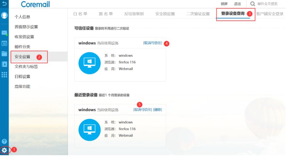 如果你的电脑所属权变更,如电脑需更换,请进入邮箱,删除对这台电脑(浏览器)的授权,如下图: