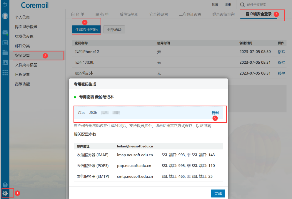 当你使用邮箱客户端,如Foxmail、企业微信、OutLook时,请参考下图设置专用密码后使用。客户端相关设置参参考如下: